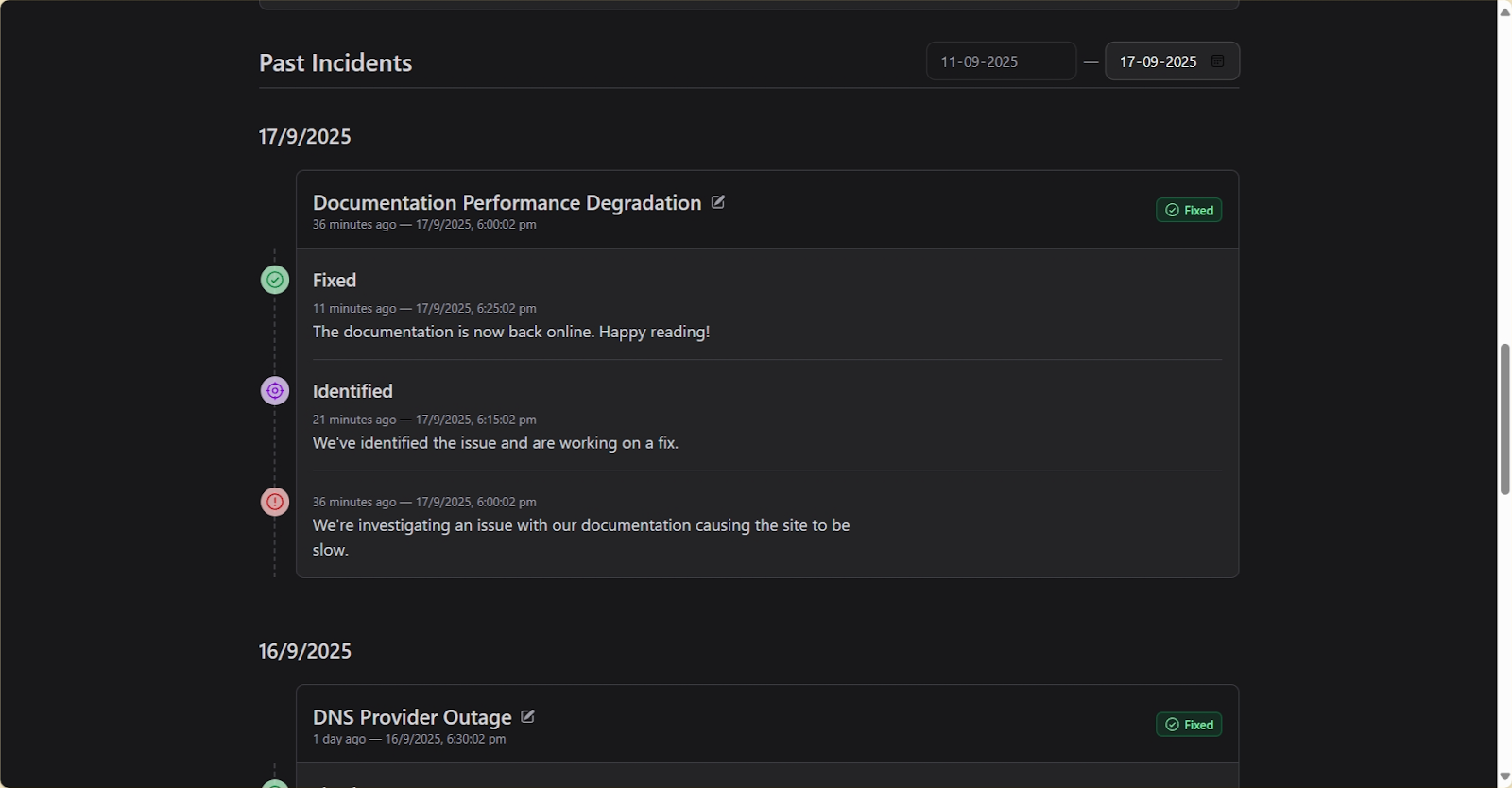- Validates SLA Breaches: For businesses with Service Level Agreements (SLAs), a status page provides a clear and public record of uptime and incidents, making it easier to validate any breaches.