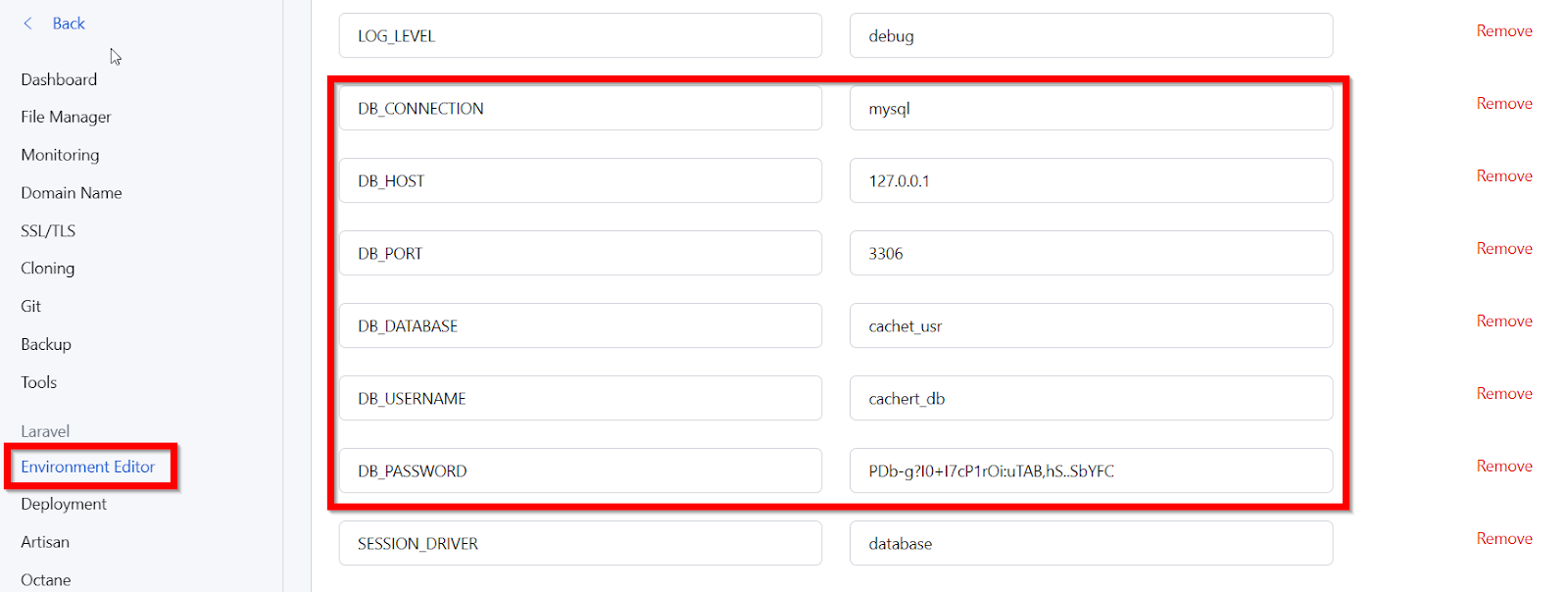 - Edit Environment Variables: Navigate to the Env Editor in the left-hand menu. This user-friendly interface is a fantastic RunCloud feature that prevents you from having to edit the .env file via the command line. Update the following database variables with the credentials you created earlier: