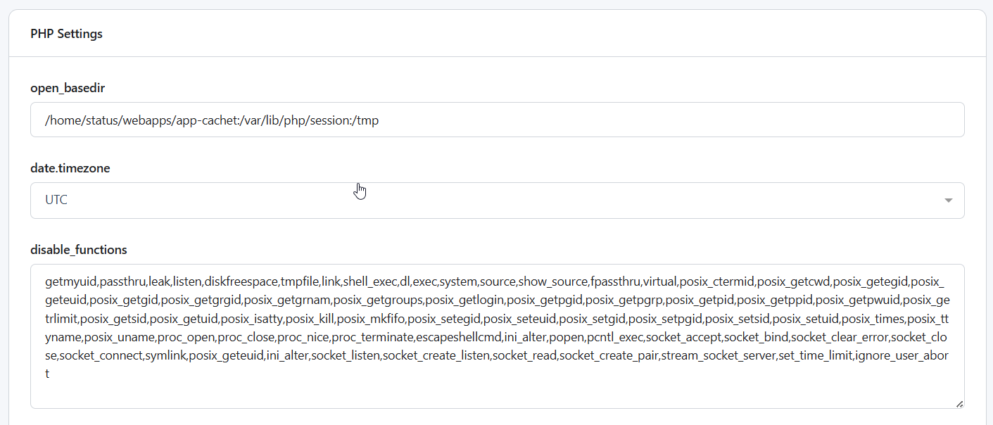 - Remove Disabled PHP function: Cachet requires the highlight_file function to be enabled to work properly. Navigate to your application settings and remove this function from the disabled list, then hit save.