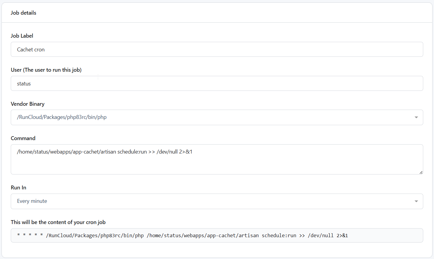 Cachet requires a background task to be run every minute to check metrics and handle schedules. RunCloud’s Cron Job manager makes this extremely easy.