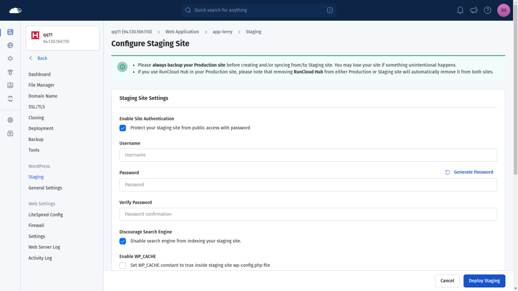 In the future, you can use the WordPress staging environment feature directly within the RunCloud dashboard to create and manage these test sites with just a few clicks. To learn how to implement this process, we recommend referring to our comprehensive article on creating a WordPress staging environment.