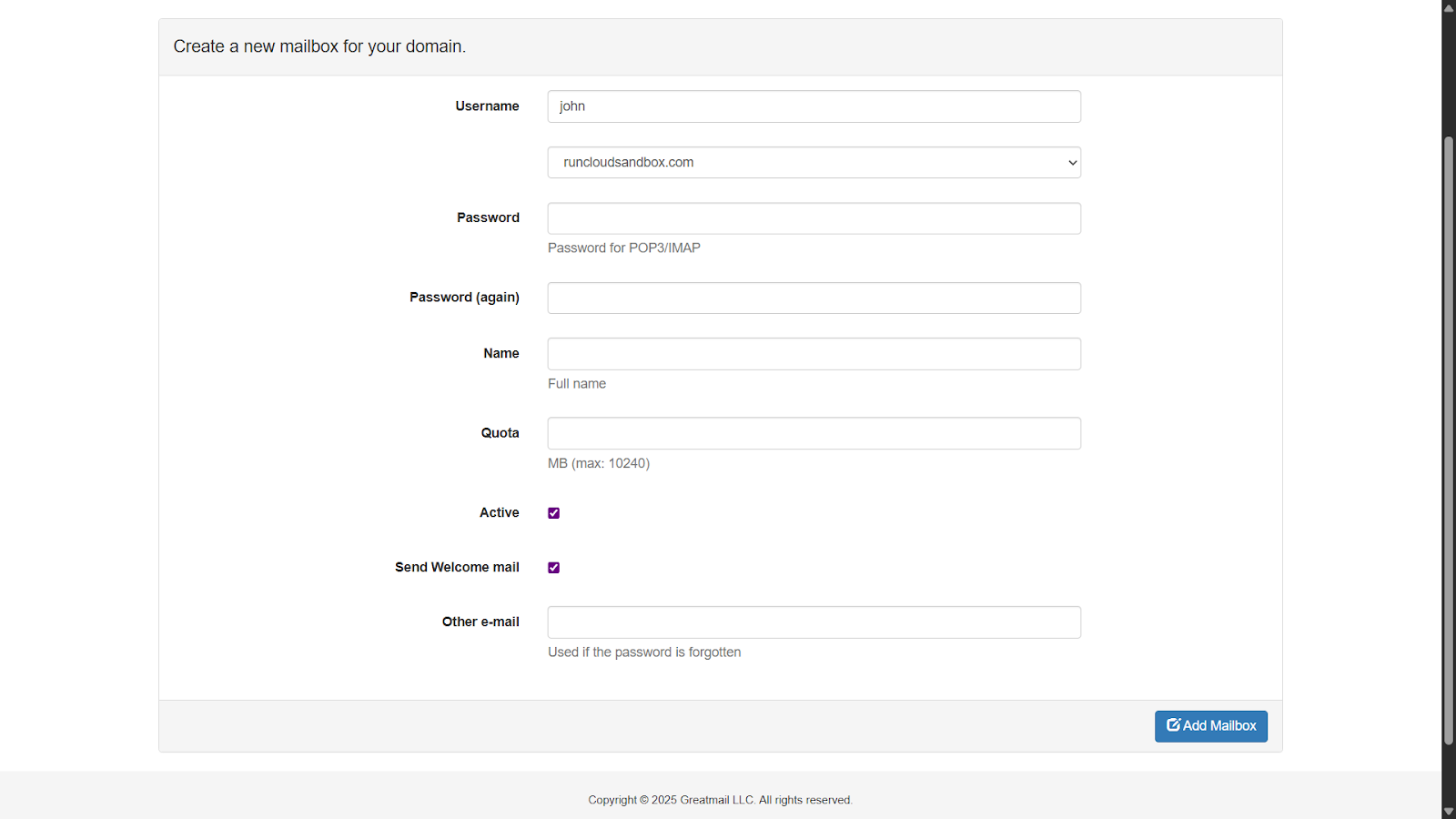 - Quota: Specify mailbox storage in MB (1000 MB = 1 GB; maximum 10240 MB).