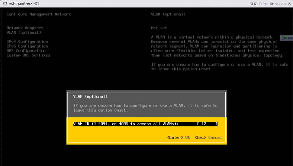 Under the “Configure Management Network”, choose the right adapter for ESX host management vMKernel interface and enter ESX management VLAN ID.