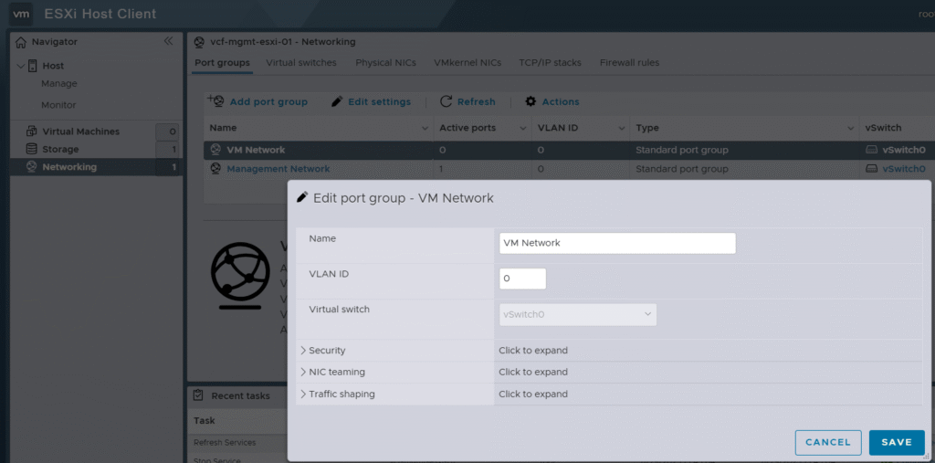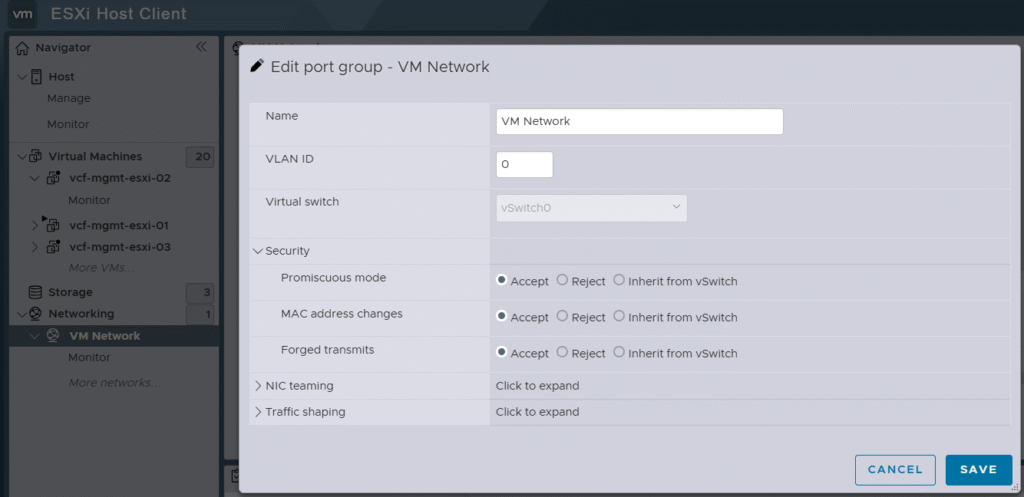 This “VM Network” is a portgroup on the physical ESX host installed on my bare metal hardware server. As it will be used for the nested ESX hosts for my VCF lab, I have enabled Promiscuous mode, MAC address changes, and Forged transmits.