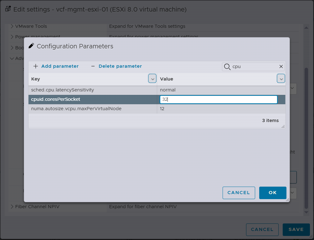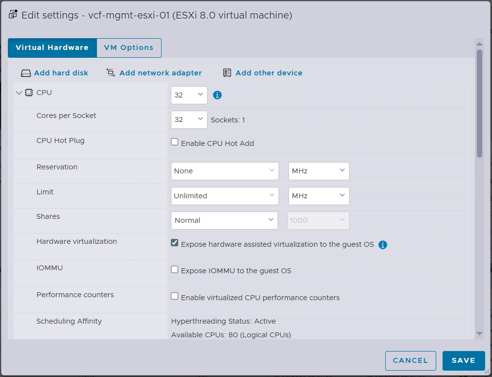 As VCF Automation VM requires 24vCPU, I will make sure that 32vCPU is assigned to each of the 3 nested ESX hosts. To cater for the VMUG Advantage VCF license (A VMUG Advantage VCF license provides 128 cores for a one-year, non-production term), I will be tweaking the CPU configuration as per the below.