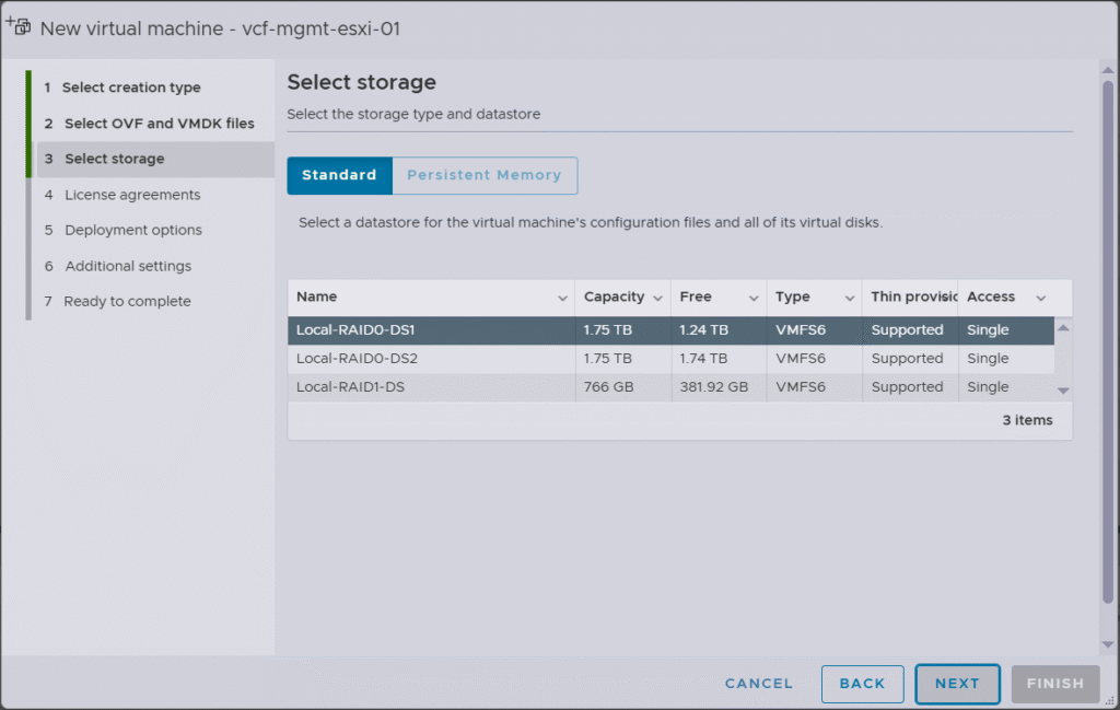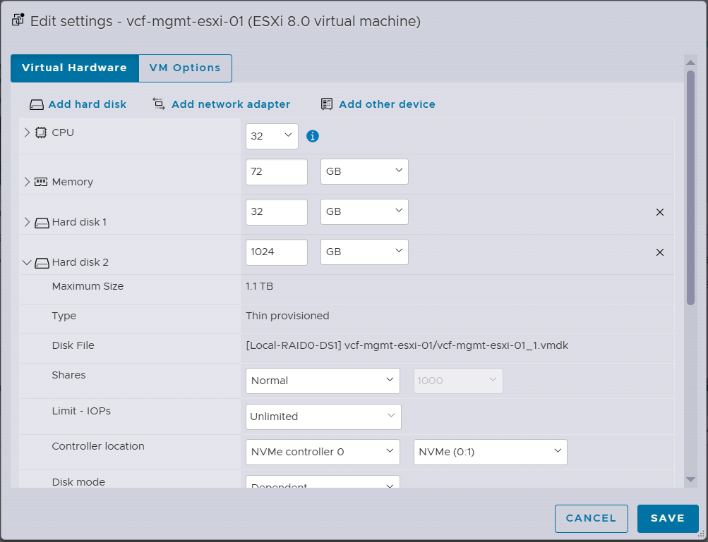 Regarding RAM resources, I will be assigning 72 GB RAM per nested ESX host to cater for the components that will be deployed in the VCF MGMT domain.