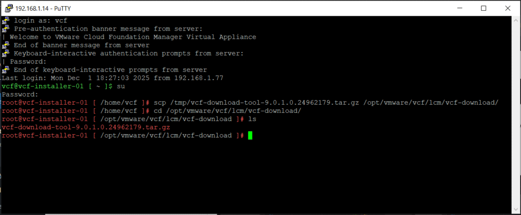 Using WinSCP, connect to VCF installer appliance using vcf user account, then copy the VMware Cloud Foundation Download Tool file (vcf-download-tool-9.0.1.0.24962179.tar.gz) to the /opt/vmware/vcf/lcm/vcf-download directory.