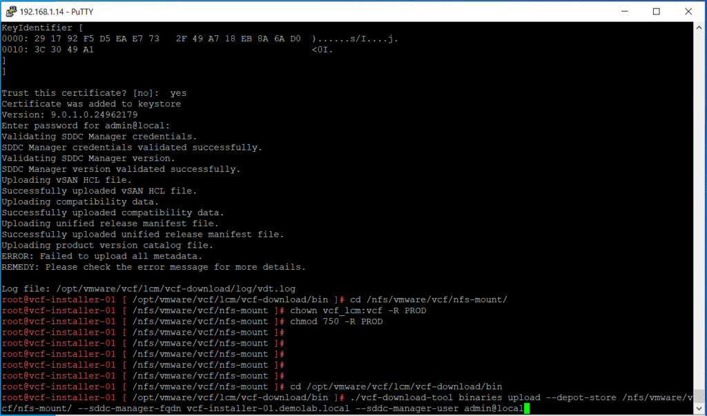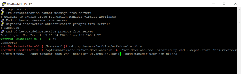 ./vcf-download-tool binaries upload –depot-store /download/directory/ –sddc-manager-fqdn FQDN –sddc-manager-user admin@local