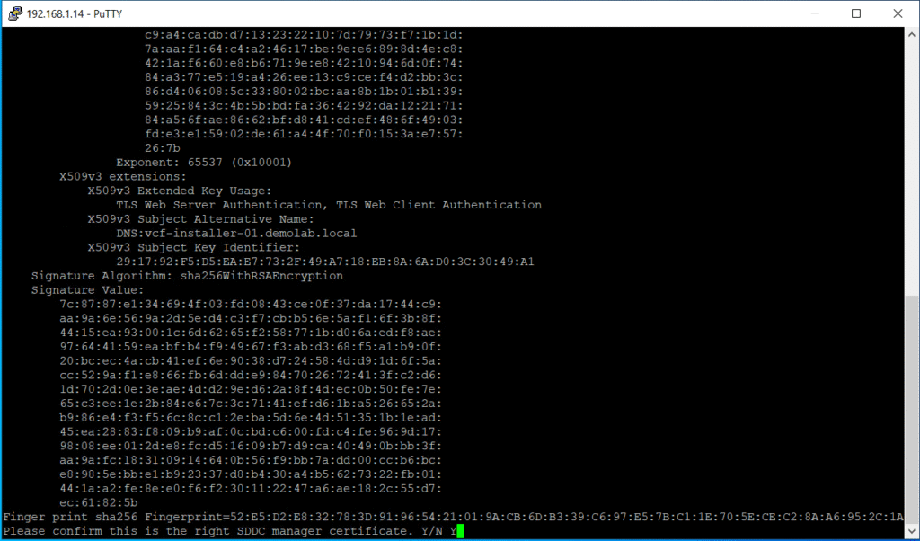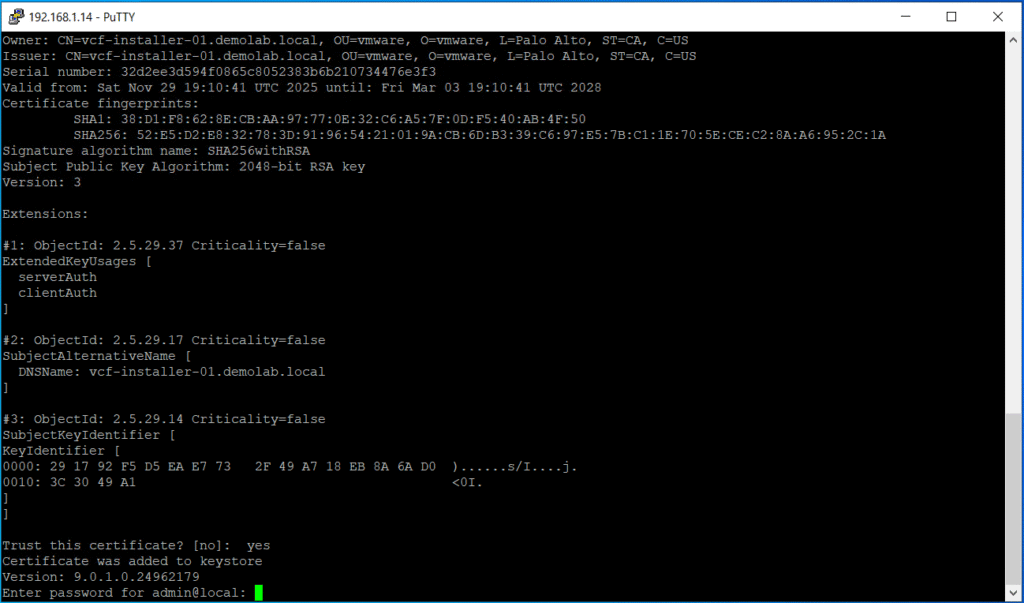 Next you need to trust the certificate of the VCF installer and it will be added to the Keystore automatically.
