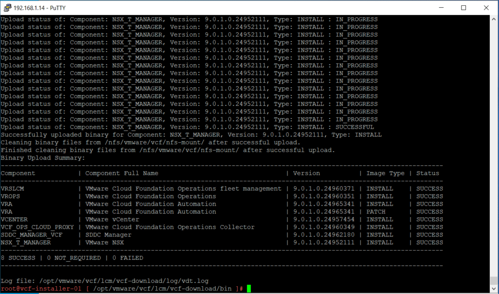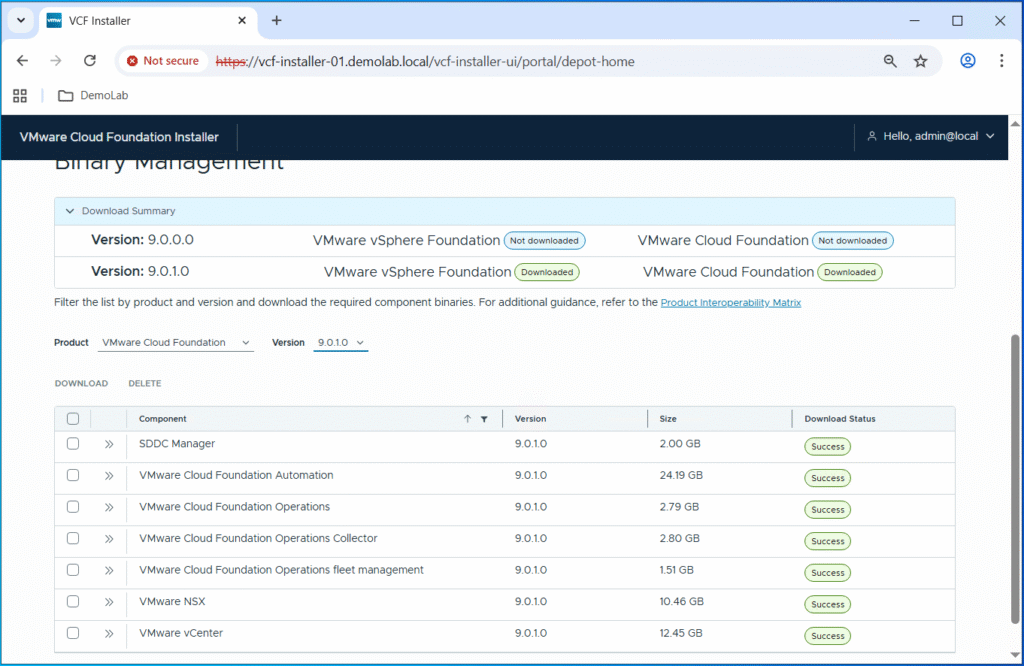 Click on “Depot Settings and Binary Management” and you should see that all the core VCF components successfully uploaded with a “Download Status” as “Success“.