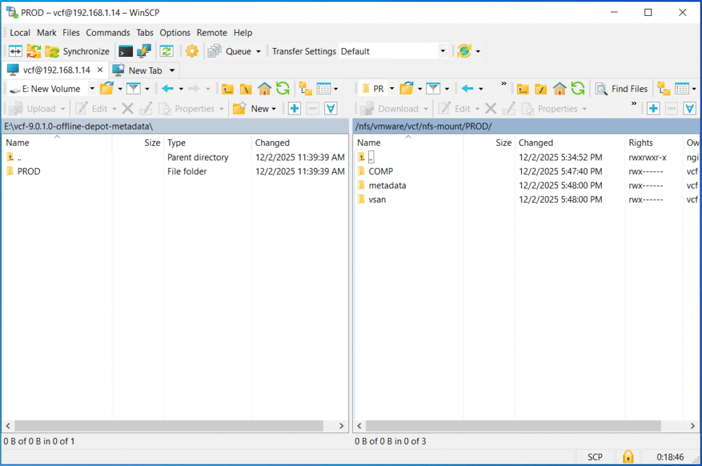 Now you need to transfer the PROD directory to the VCF installer appliance (for example using WinSCP tool). You can select any location on the VCF Installer appliance that has enough free space available. In my case, I will be choosing /nfs/vmware/vcf/nfs-mount/.
